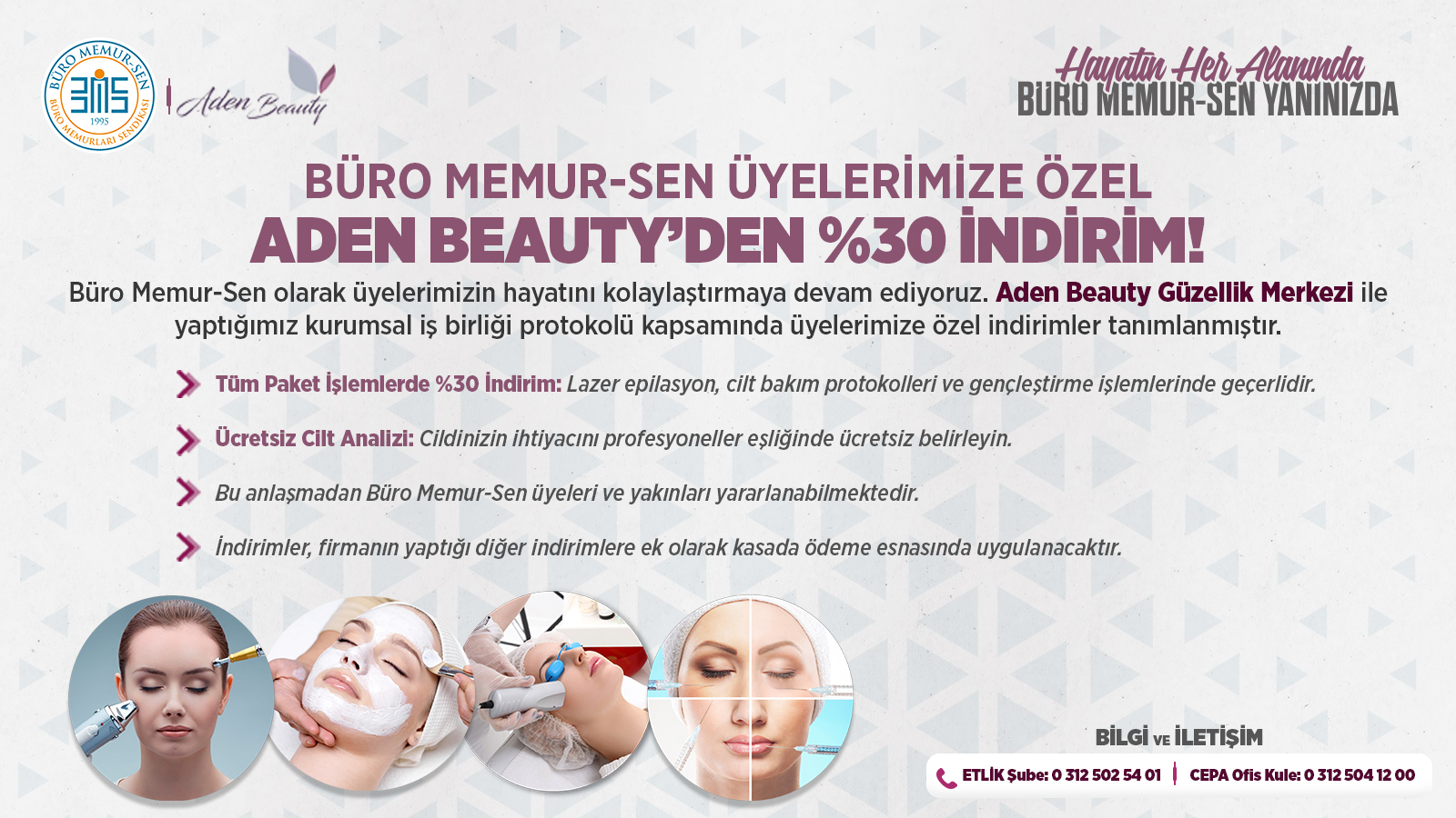 Büro Memur-Sen olarak üyelerimizin hayatını kolaylaştırmaya devam ediyoruz. Aden Beauty Güzellik Merkezi ile yaptığımız kurumsal iş birliği protokolü kapsamında üyelerimize özel indirimler tanımlanmıştır.